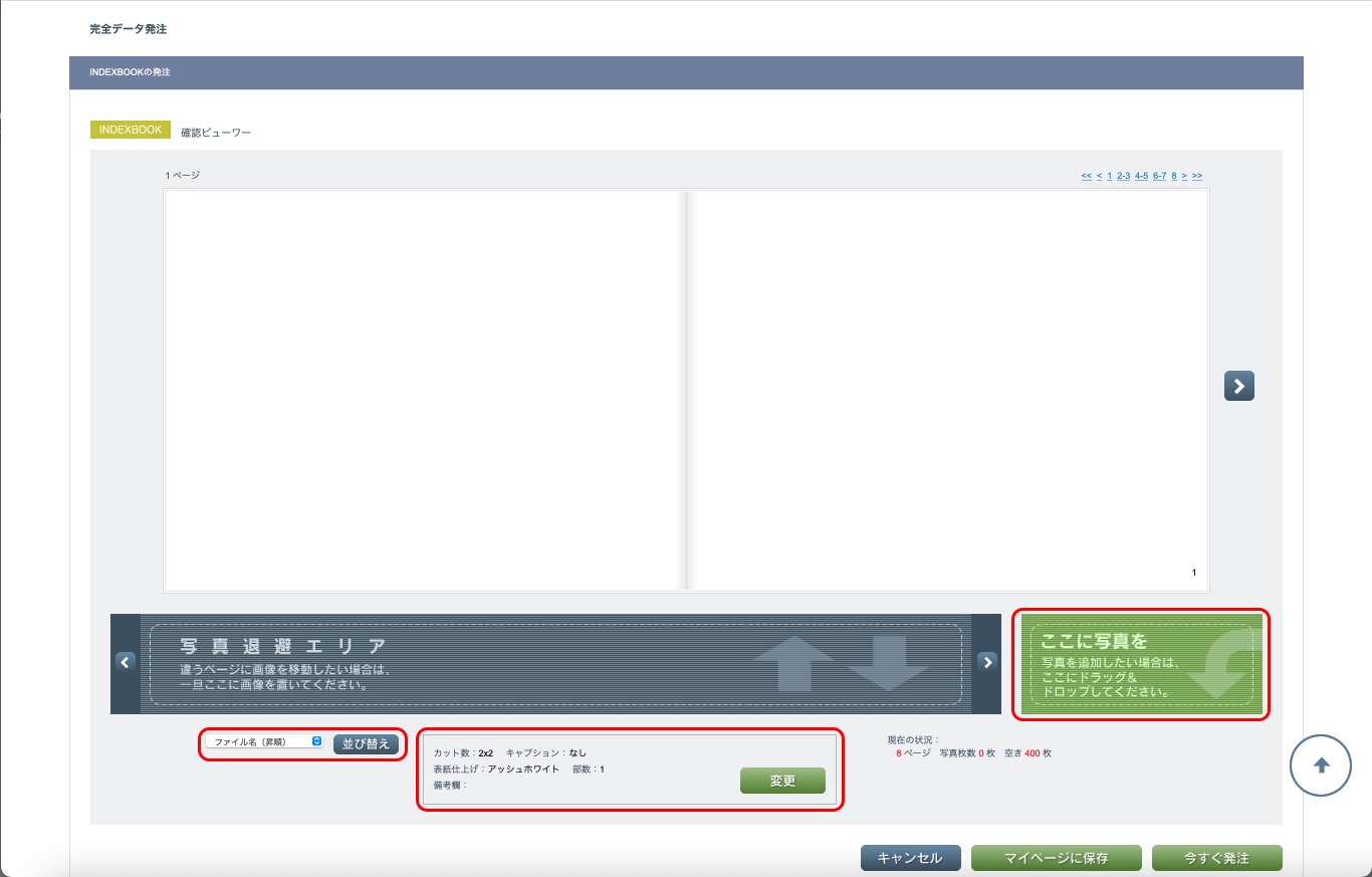 該当のJPGデータを全て選択し、[ここに写真を] へドラッグ&ドロップしてください。自動的に画像が各ページに配置されます。画像は一度に複数枚選択してアップロードすることができます。