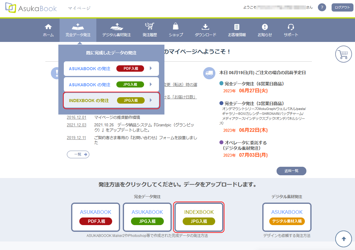 トップページより、完全データ発注>「INDEXBOOKの発注 JPG入稿」、もしくは「INDEXBOOK JPG入稿」ボタンをクリックします。