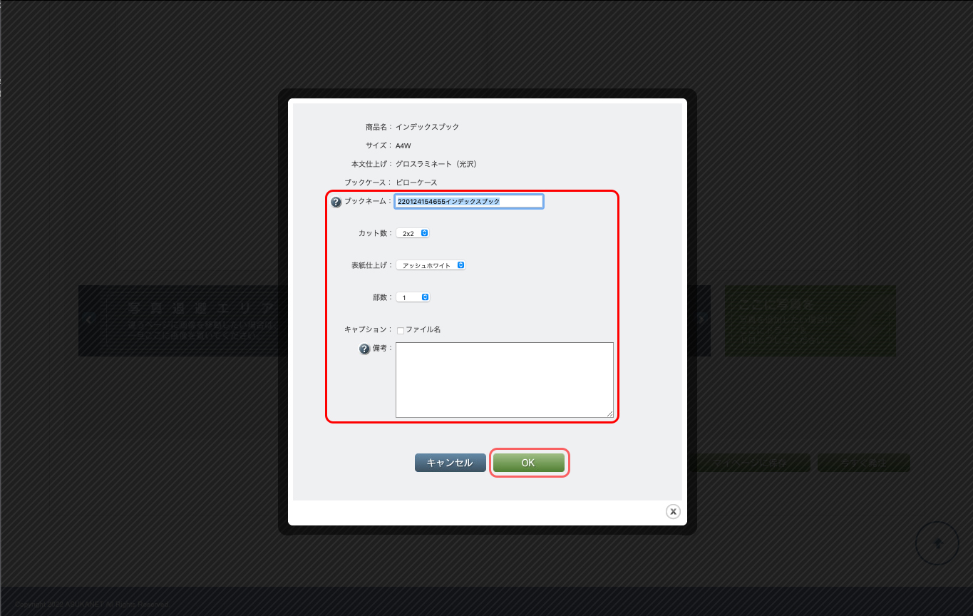 まず、これから作成するインデックスブックの注文詳細を選択してください。