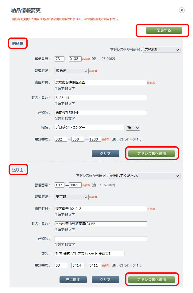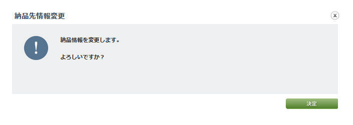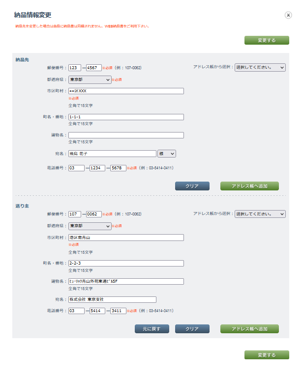 「納品先変更」ボタンをクリックし、新たな納品先情報を入力してください。