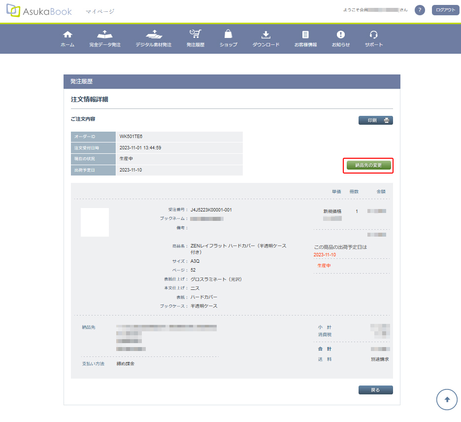 マイページ>決済画面>『納品先の変更』ボタンをクリックします。