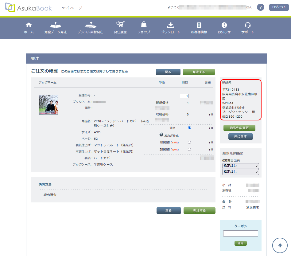 「変更する」ボタンをクリック後、納品先の住所が変更されていることを確認してください。