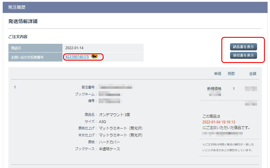 マイページ>発注履歴 より該当のオーダーIDをクリックすると、注文情報詳細が表示されます。