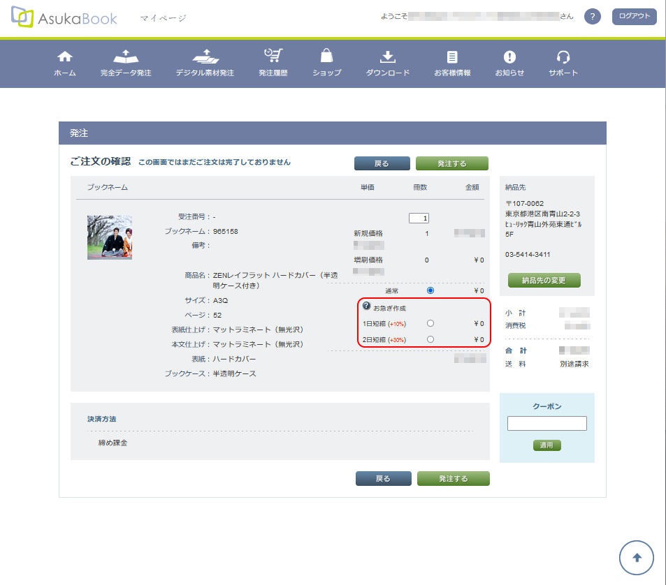 ※1オーダーIDではなく、お急ぎ作成サービスをご利用になるブックの合計金額の10%です。