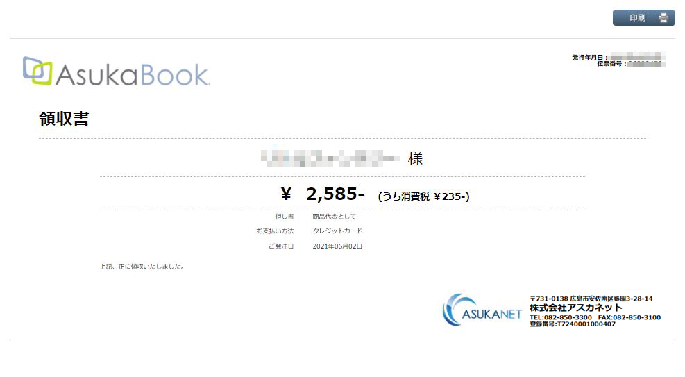 表示される領収書には、アスカネットのインボイス登録番号(適格請求書発行事業者登録番号)が記載されています。