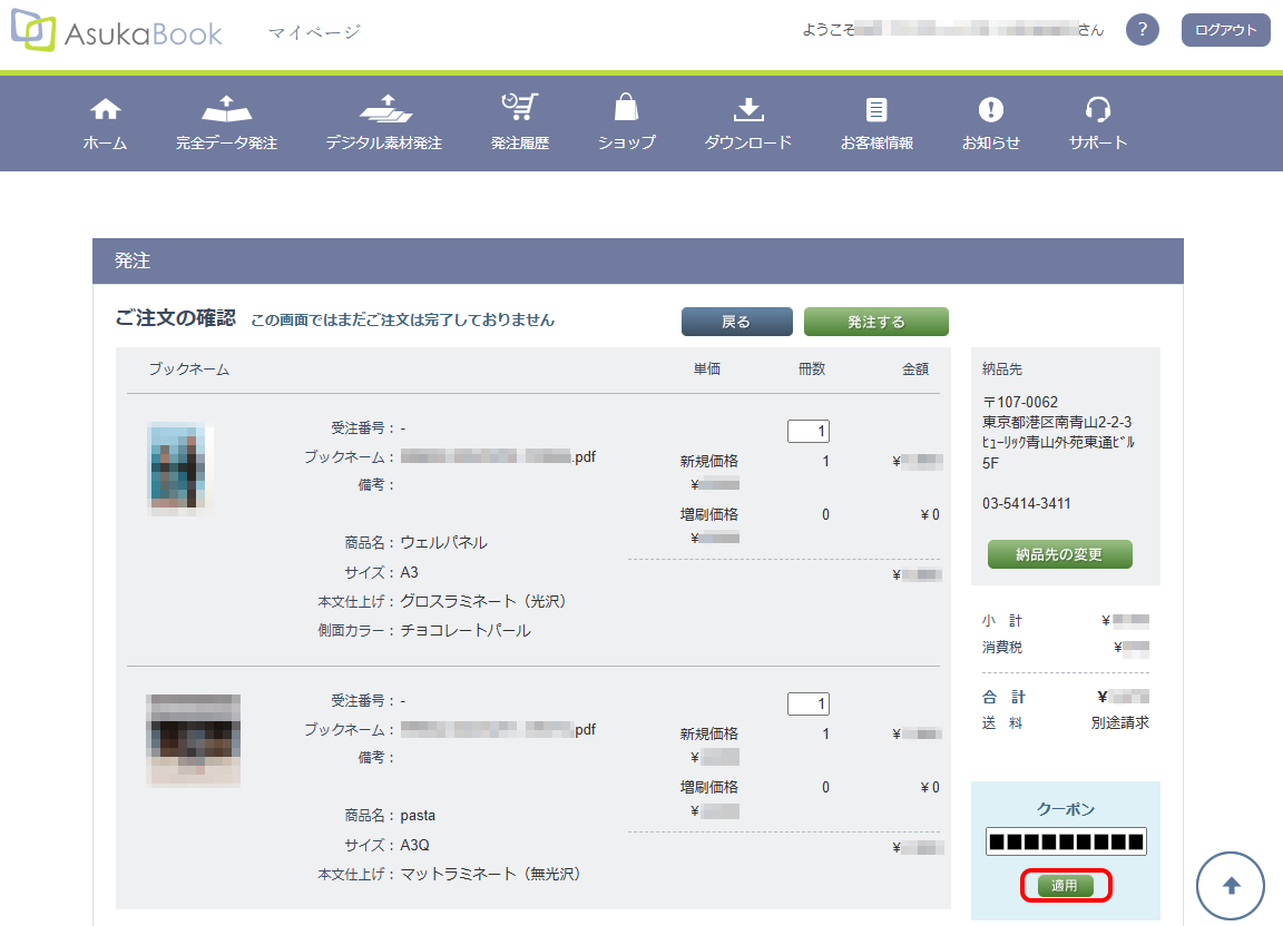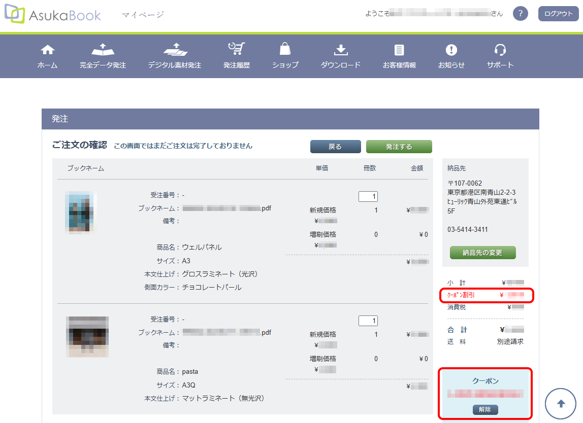 クーポンコードは、商品のアップロードが完了し、発注画面にてご入力いただくことで、割引が適用されます。