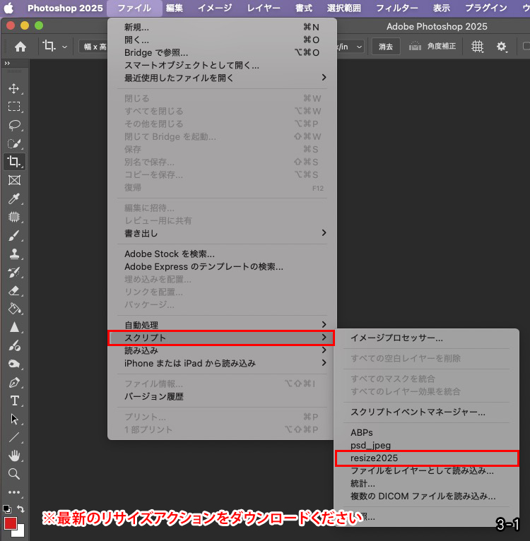 ファイル>スクリプト>resize20XX(最新のもの)を選択(画像3-1参照)
