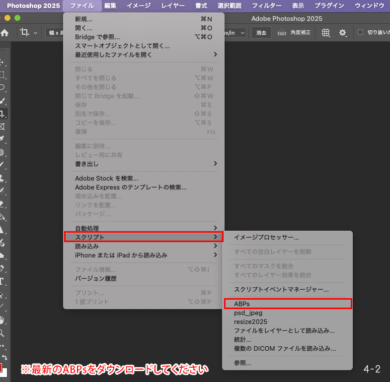 ファイル>スクリプト>ABPsを選択(画像4-2参照)