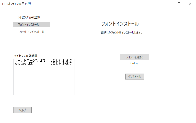2、オーナーよりフォントデータ「Fonts.zip」データを受領いただき、LETSデスクトップアプリを起動し、「フォントインストール」メニューを選択します。「フォントを選択」ボタンをクリックし、フォントのzipファイルを選択します。「インストール」ボタンをクリックすることでインストールが開始されます。