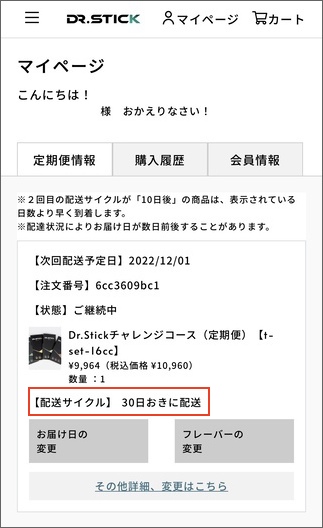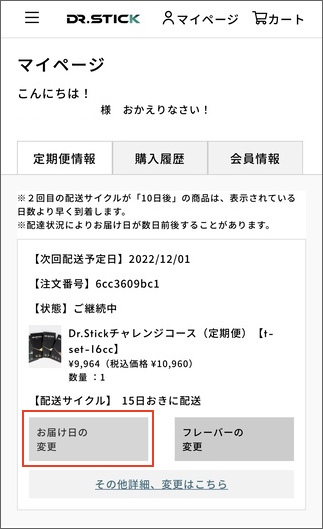 1.マイページログイン後、変更したい定期便の「お届け日の変更」を選択します。