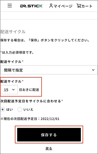 2.赤枠の箇所で希望の配送サイクルを設定し、「保存する」を選択します。
