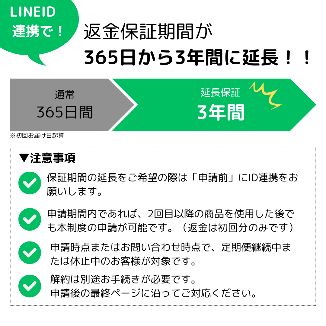 万が一、2回目以降をお受取りした場合でも、本保証の対象は「初回商品」のみとなりますのでご注意ください。