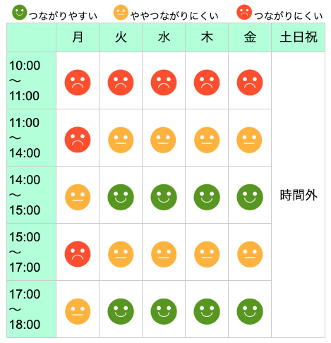 お電話でのお問い合わせの際は、以下の繋がりやすい時間帯を目安にお問合せください。