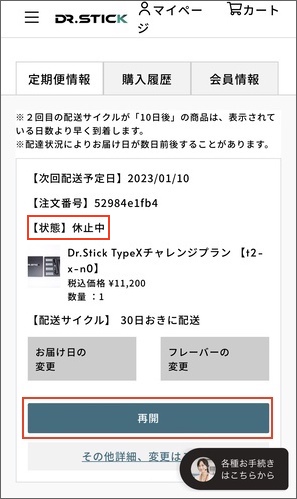 休止中の定期便につきましては、マイページより再開の手続きが可能です。