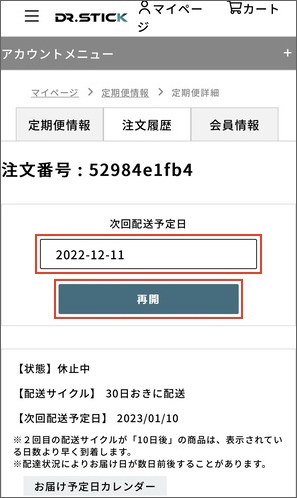 2.赤枠の箇所でご希望の次回配送予定日を選択し、「再開」を選択します。