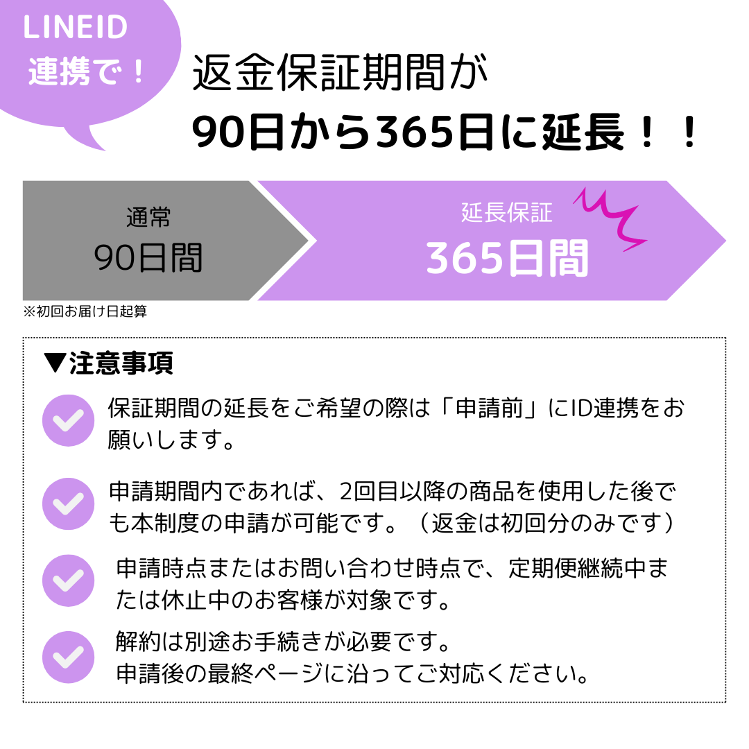 万が一、2回目以降をお受取りした場合でも、本保証の対象は「初回商品」のみとなりますのでご注意ください。