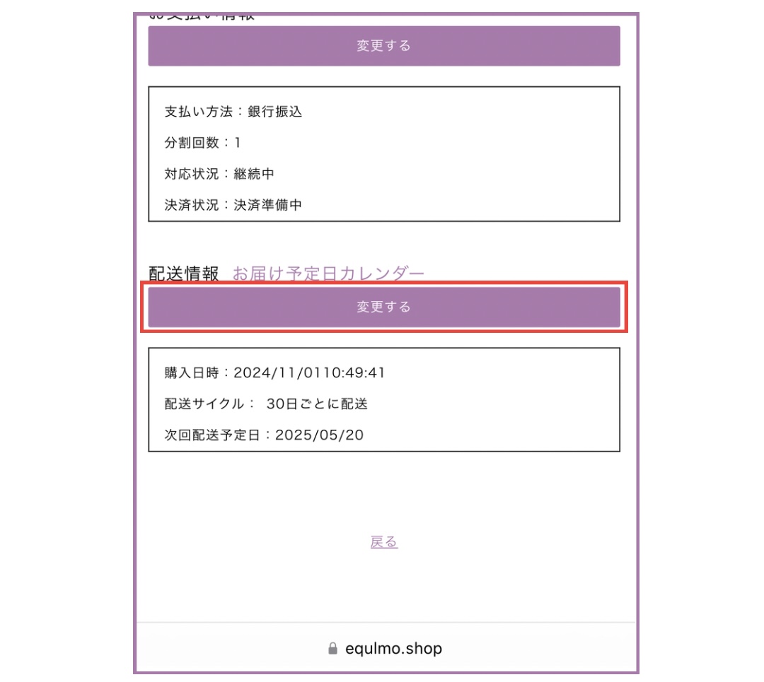 2.「配送情報」箇所の「変更する」を選択します。