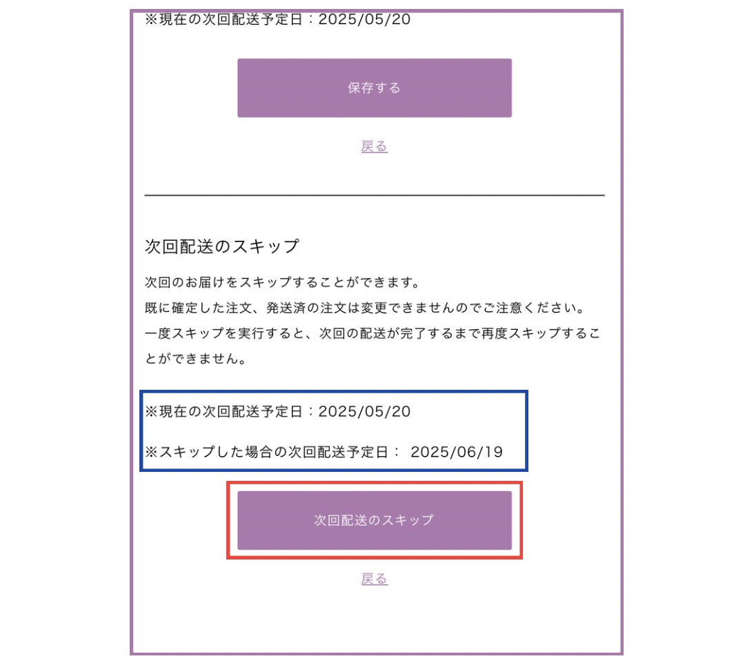 3.青枠の箇所に「次回配送予定日」、「スキップ後の次回配送予定日」が表示されるので、問題なければ「次回配送のスキップ」を選択します。