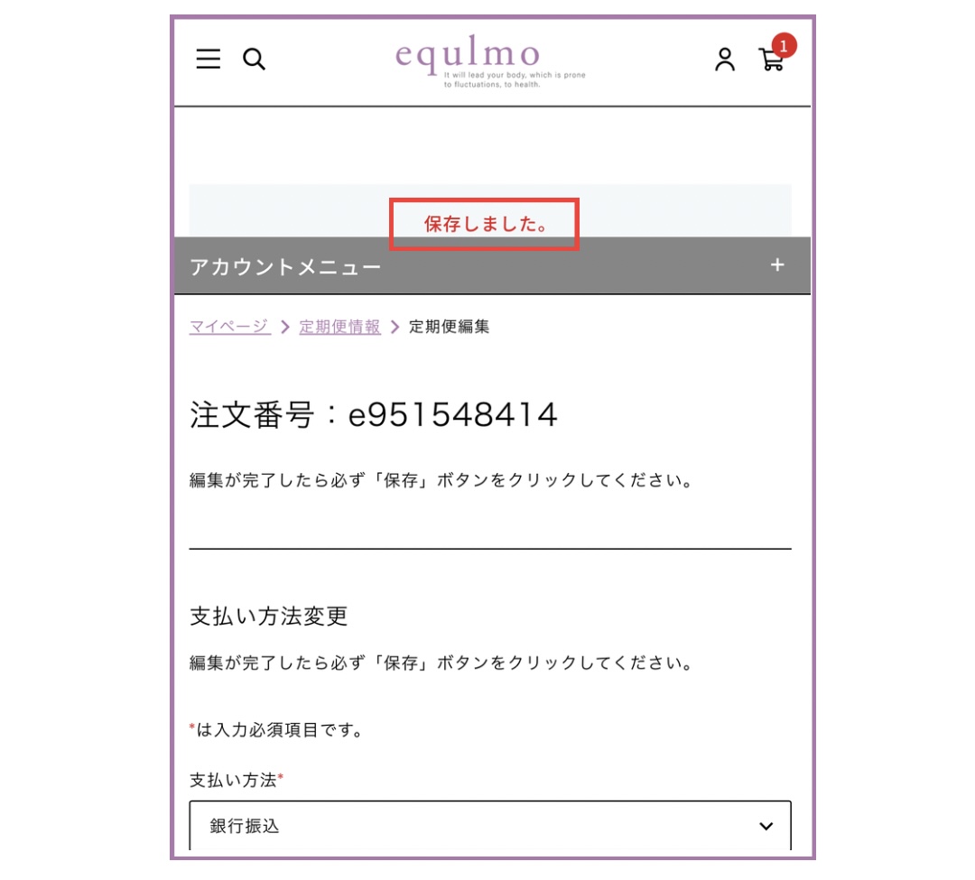 4.「保存しました」と表示され、「次回配送予定日」が変更されていれば完了です。
