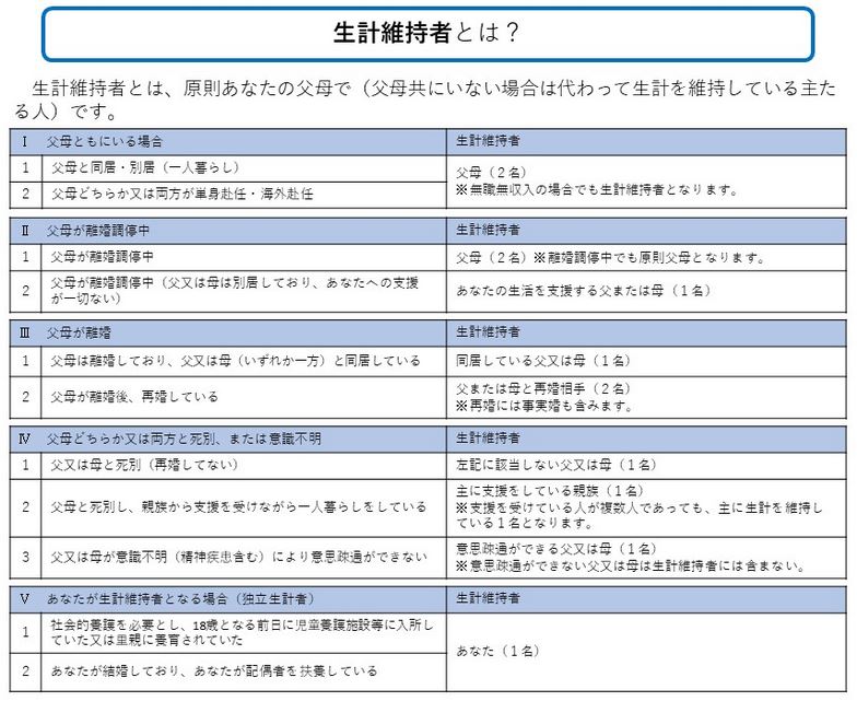 生計維持者とはどのような人ですか? あなたの生計を維持する人で、原則は父母両方、父母ともにいない場合は代わって生計を維持している主たる人となります。 詳しくは表をご確認ください。 # 給付 # 貸与 # 生計維持者