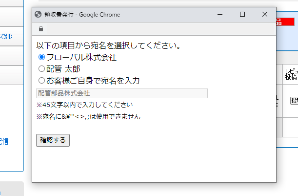 ※任意の宛名をご希望のお客様は、「お客様ご自身で宛名を入力」を選択し、宛名をご入力後、確認するボタンをクリックしてください。