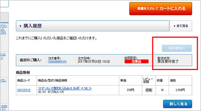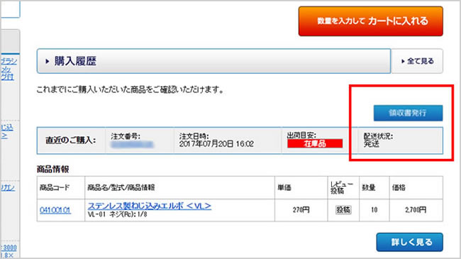 ※配送状況が「発送」になっていない場合は、領収書は発行できません。