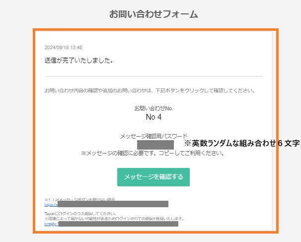 自動応答メール内に記載されるメッセージ確認用パスワード(英数字ランダムな組み合わせ6文字)の記載の有無を設定できます。