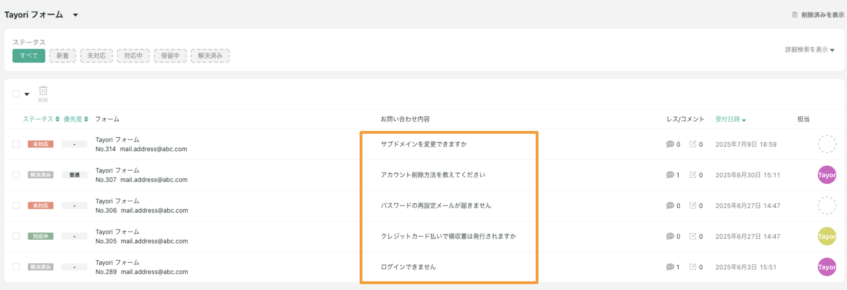 3.「複数行テキスト」項目、「名前」項目、「名前カナ(一行)」項目がない場合:「メールアドレス」が表示されます。