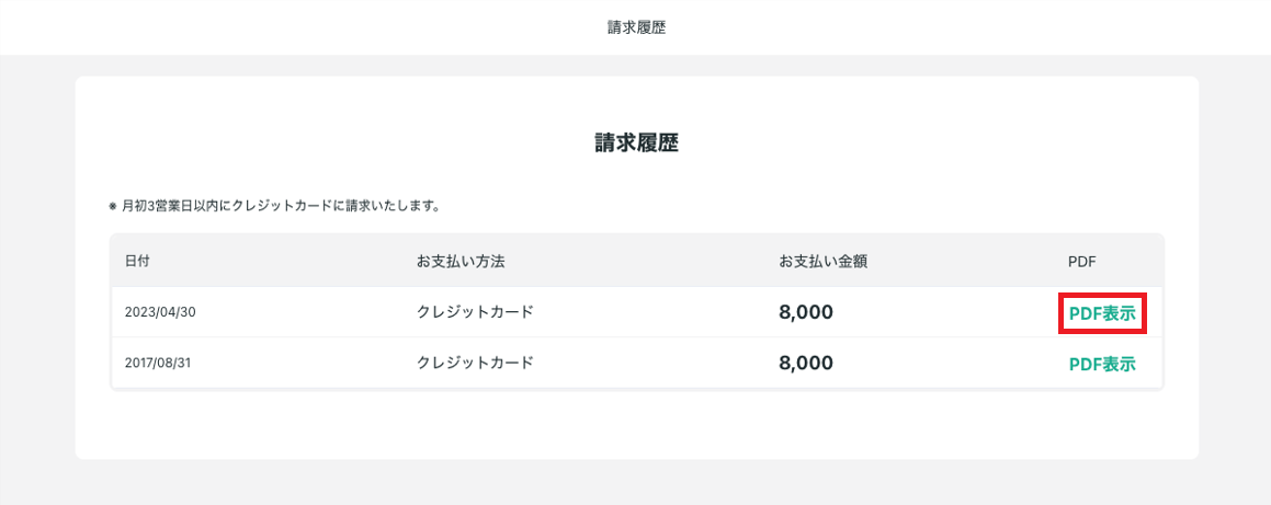 ③「請求履歴」各月のご利用金額の右側に表示される「PDF表示」をクリック