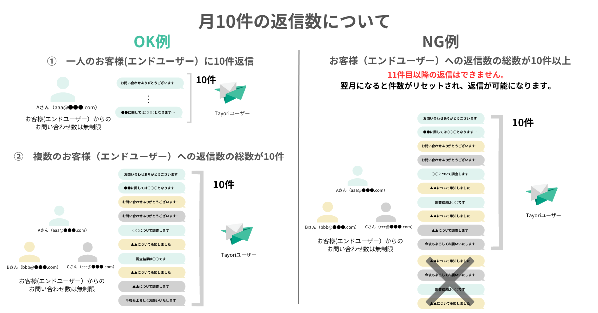 【仕様】フリープランにおけるフォーム機能の「返信可能数10件/月」とはどういう定義ですか 1ヶ月間にTayoriユーザー側から送ることができる返信の総数です。 月に11件以上の返信をご希望される場合は、有料プランへのご変更をぜひご検討ください。 # FAQ # メール # フリープラン # 返信 Facebook SHARE Twitter SHARE LINE 送る Hatena BOOKMARK