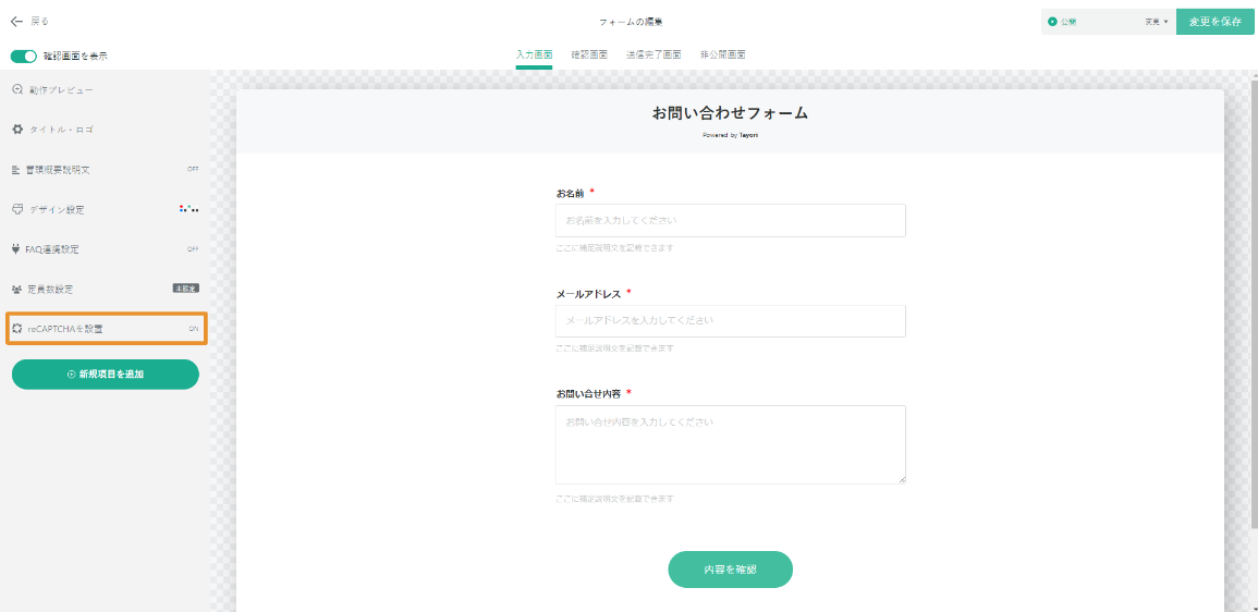該当フォームの編集画面にて「reCAPTCHAを設置」をONにすることで設置可能です。