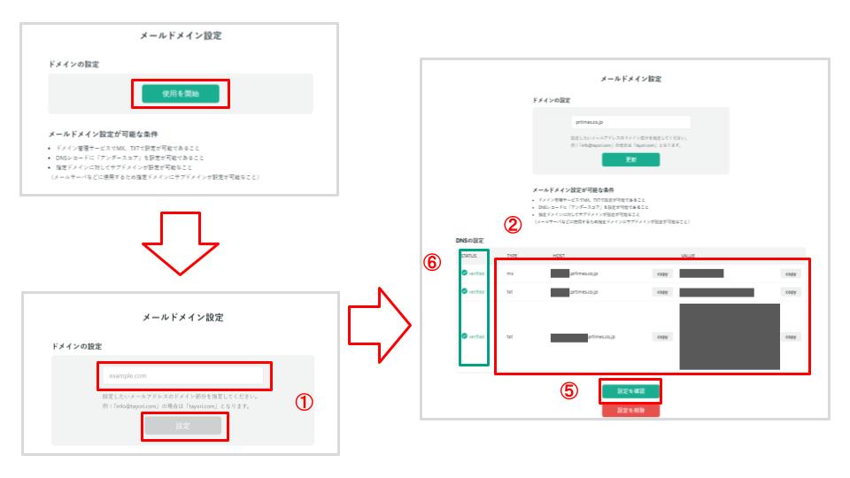 ⑤④にて確認ができたら、Tayori管理画面「独自ドメインメール設定」に戻り「設定を確認」をクリック