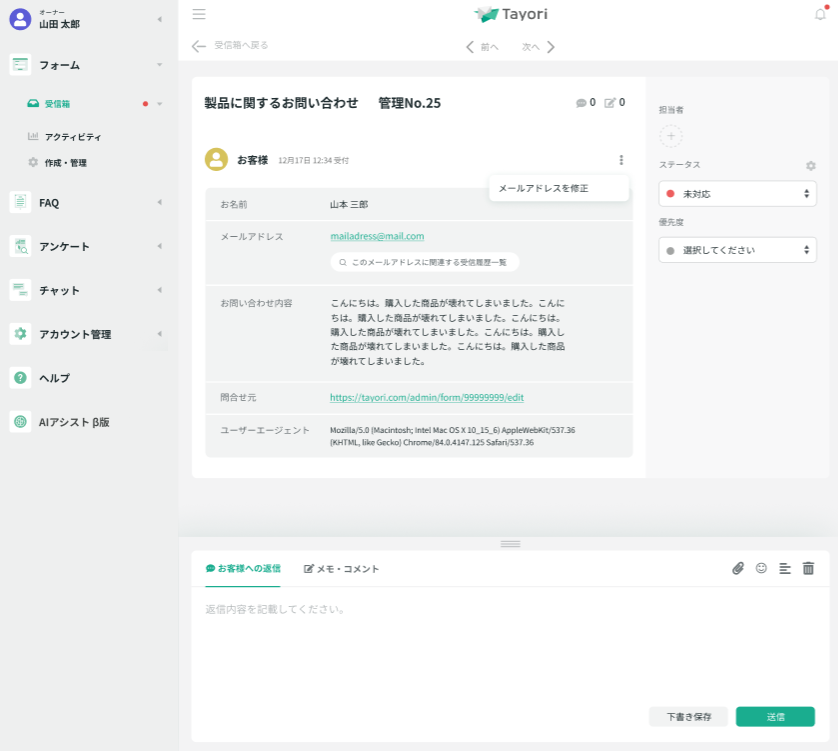 そのため、アップデート以前に受付・確認しているお問い合わせは既読状態でも太字で表示される仕様です。ご了承くださいませ。