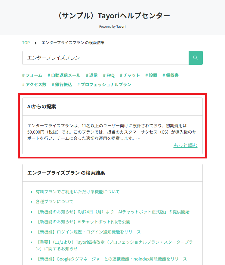 今回TayoriのFAQに搭載した「AI検索機能」は、これまでのFAQ上の関連するページを表示する機能に加え、