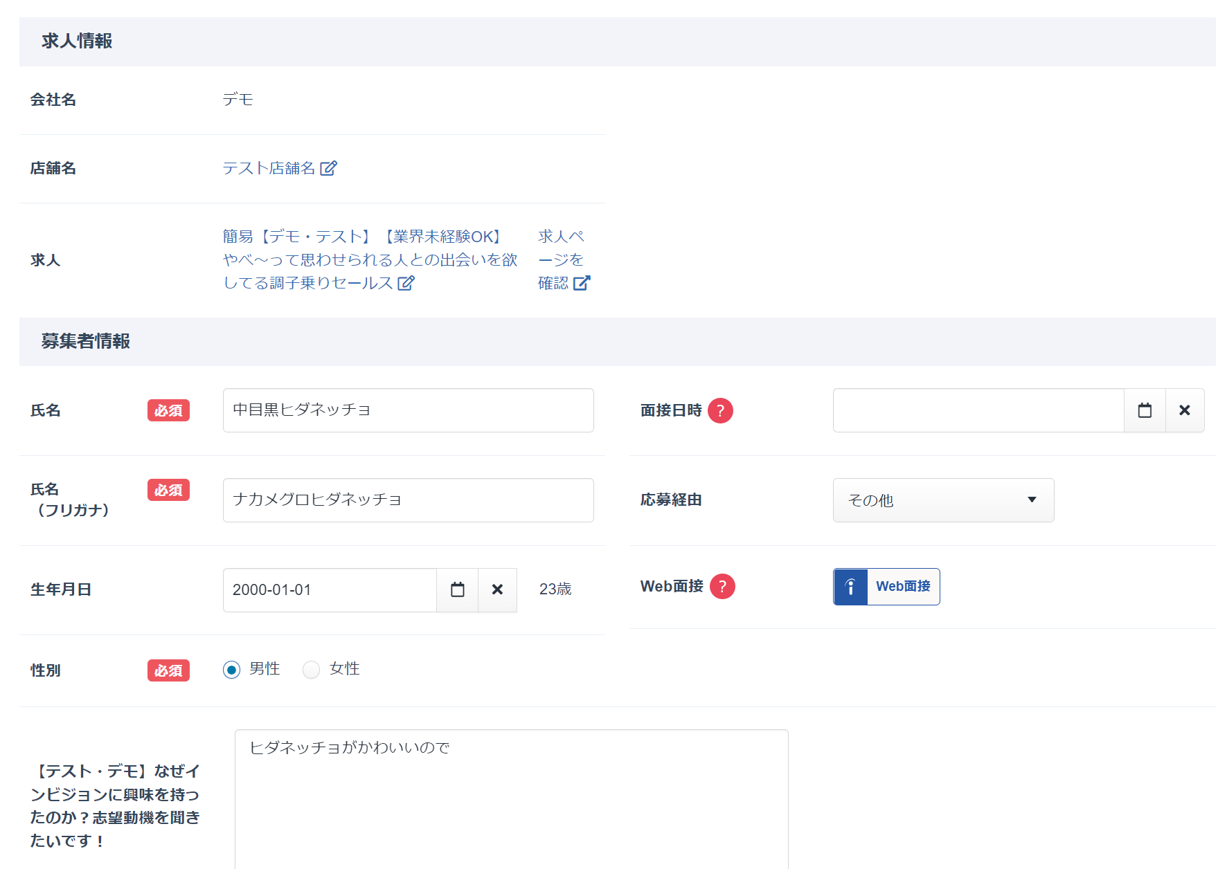 氏名、応募経由、生年月日、性別、自由項目の回答が表示されます。