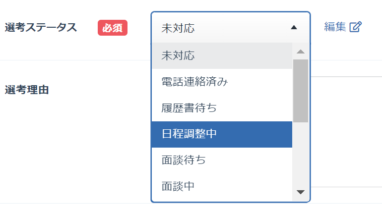 初期設定では「未対応」、「採用」、「不採用(お見送り) 」、「不採用(重複応募) 」、「不採用(辞退) 」のみです。