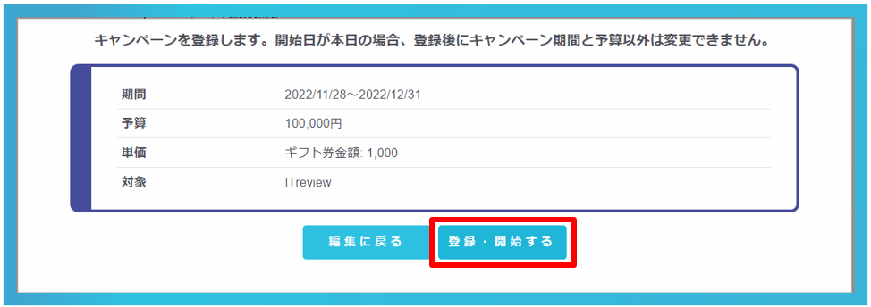 ①キャンペーン開始日が当日の場合は、そのまま「登録・開始」を押してください。