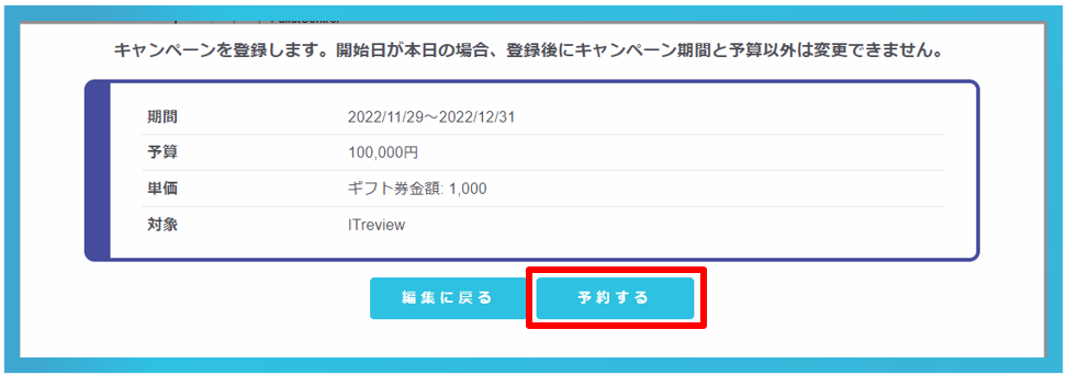 ②キャンペーン開始日を翌日以降の日付で設定している場合は、「キャンペーン開始を予約」を押してください。