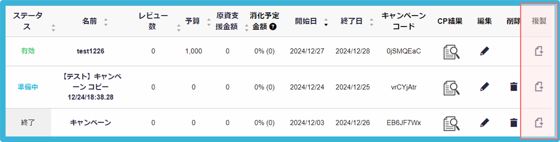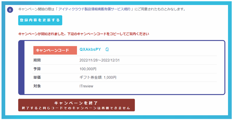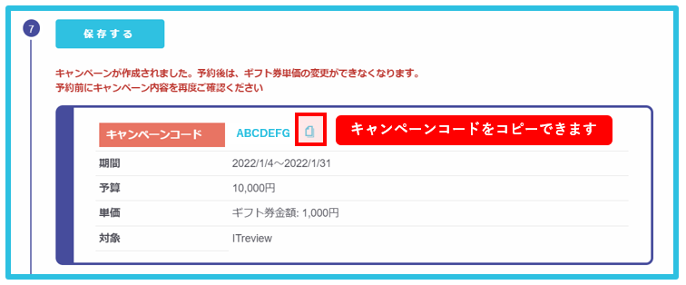 キャンペーンを開始するとキャンペーンコードが発行されます。