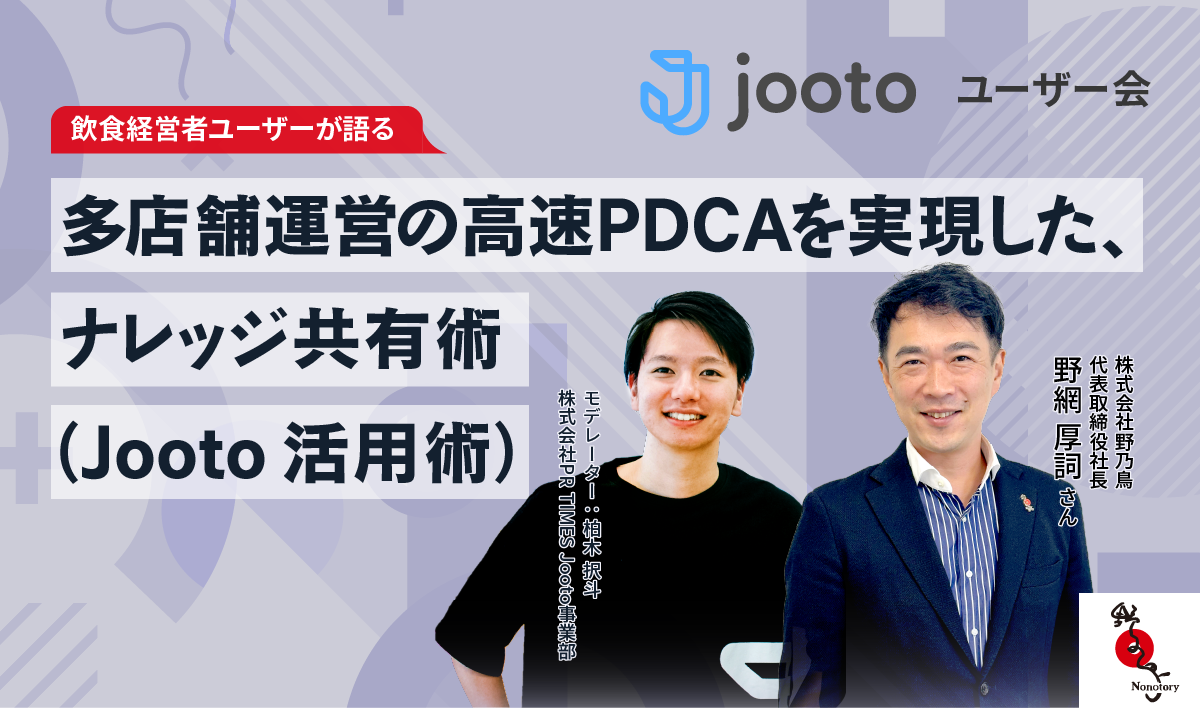 飲食経営はもちろん、食にまつわる様々な事業を展開されている株式会社野乃鳥 代表取締役 野網 厚詞さんにご登壇いただき、多店舗運営の高速PDCAを実現した、ナレッジ共有術(Jooto活用術)をお届けするオンラインイベントとなります。