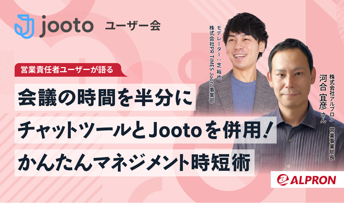 営業責任者としてマネジメントをされている株式会社アルプロン 河合 宣彦さんにご登壇いただき、チャットツールとJootoを併用したマネジメント時短術をお届けするオンラインイベントとなります。