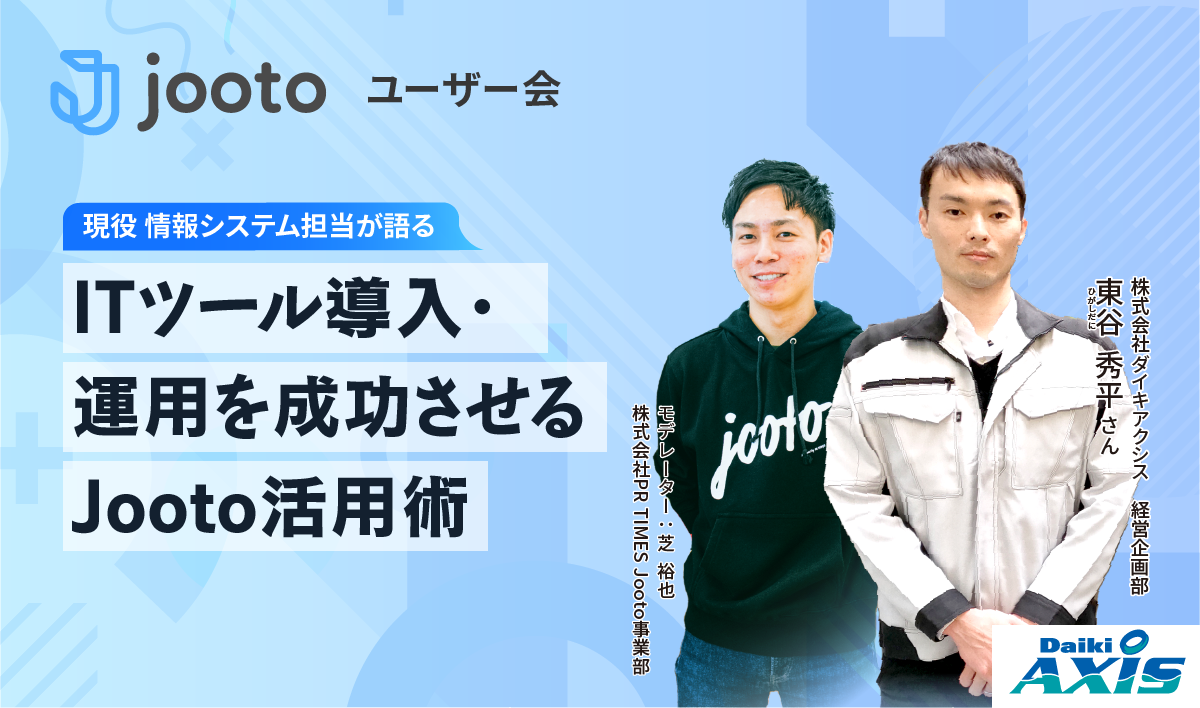 株式会社ダイキアクシスの経営企画部 東谷 秀平さんにご登壇いただき、ITツール導入・運用を成功させるJooto活用術を語っていただくオンラインイベントとなります。