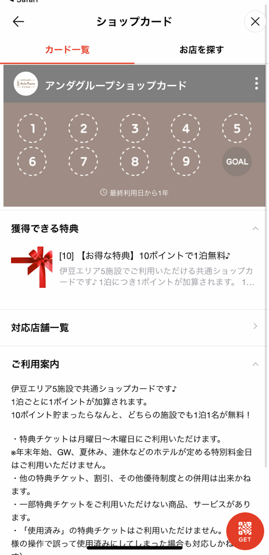アンダグループホテルにご宿泊いただくと、1泊ごとに1ポイントが加算されます。10ポイント貯まると、特典チケットが発行され『1泊1名様分』が無料になります。