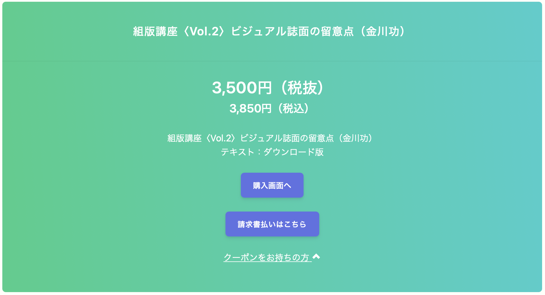 - クーポンコード:クレジットカードのみ利用可能ですのでクリックしてコードを入力し「購入画面へ」へお進みください