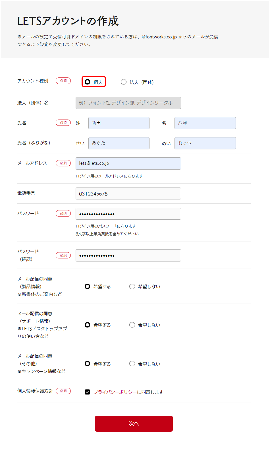 2. 「LETS アカウントの作成」画面でご入力いただき「次へ」ボタンを押してください。