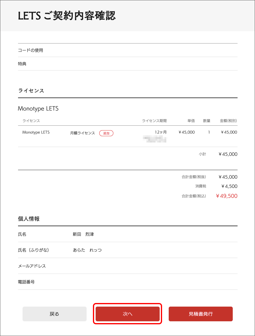 4.「LETSご契約内容確認」の内容に相違なければ「次へ」を押してください。