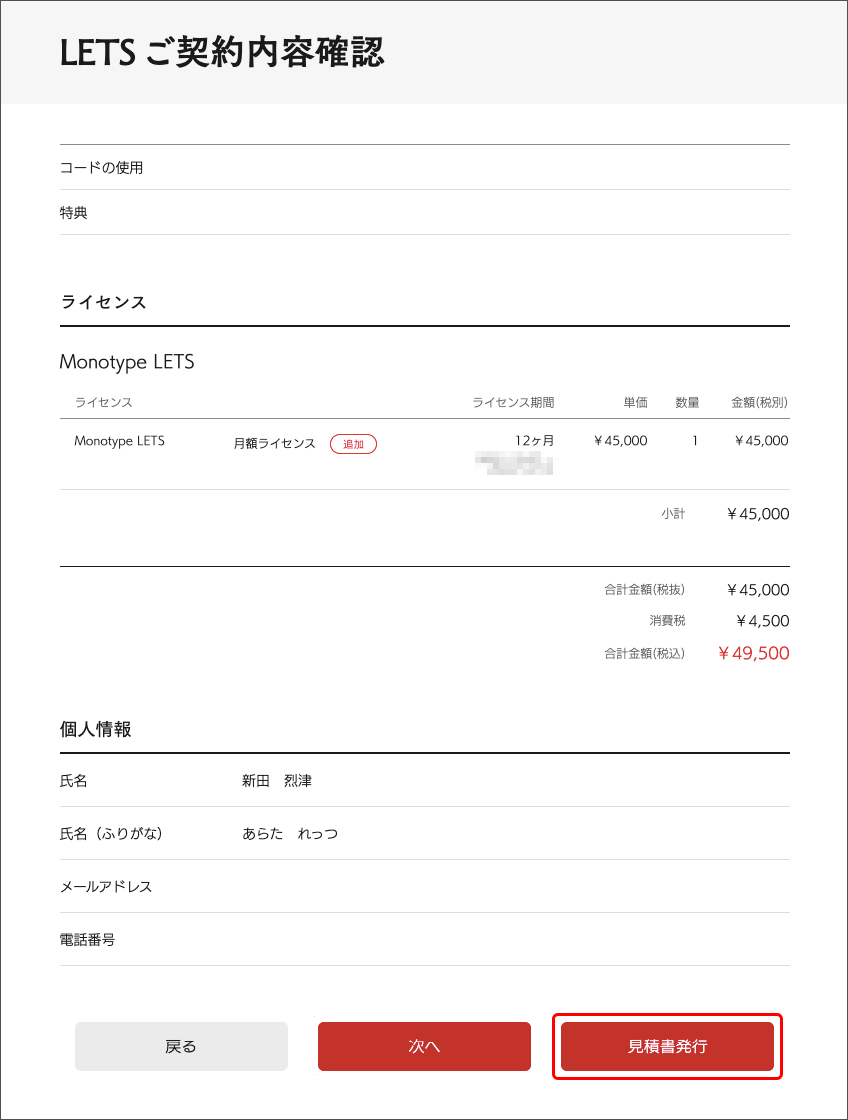 4.「LETSご契約内容確認」の内容に相違なければ「見積書発行」を押してください。