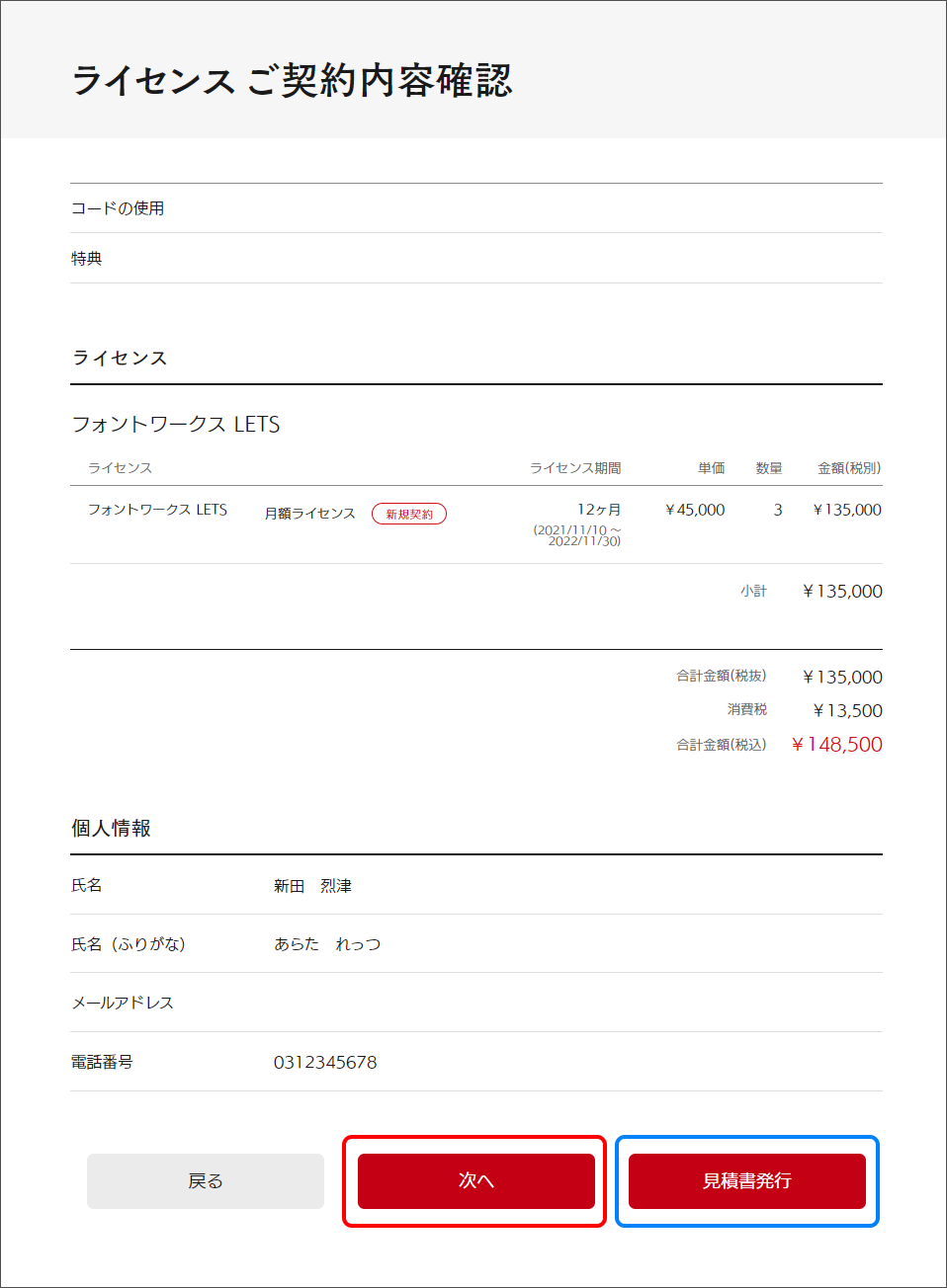 例)契約数:3ライセンス/契約月数:12ヶ月(1年)/すぐにご利用を開始したい場合