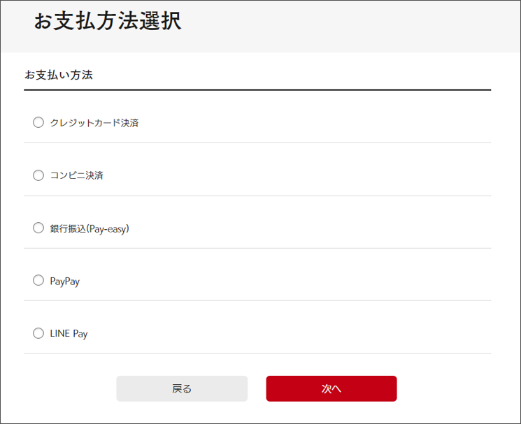 5.「お支払方法選択」をお選びいただき、「次へ」ボタンを押してください。