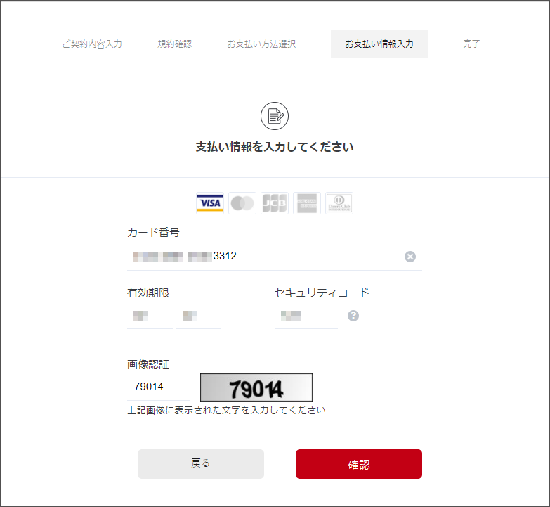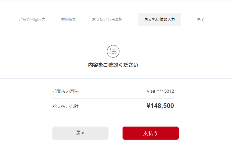 6.お支払いの情報を入力していただき「確認」ボタンを押し、確認後「支払う」ボタンを押してください。